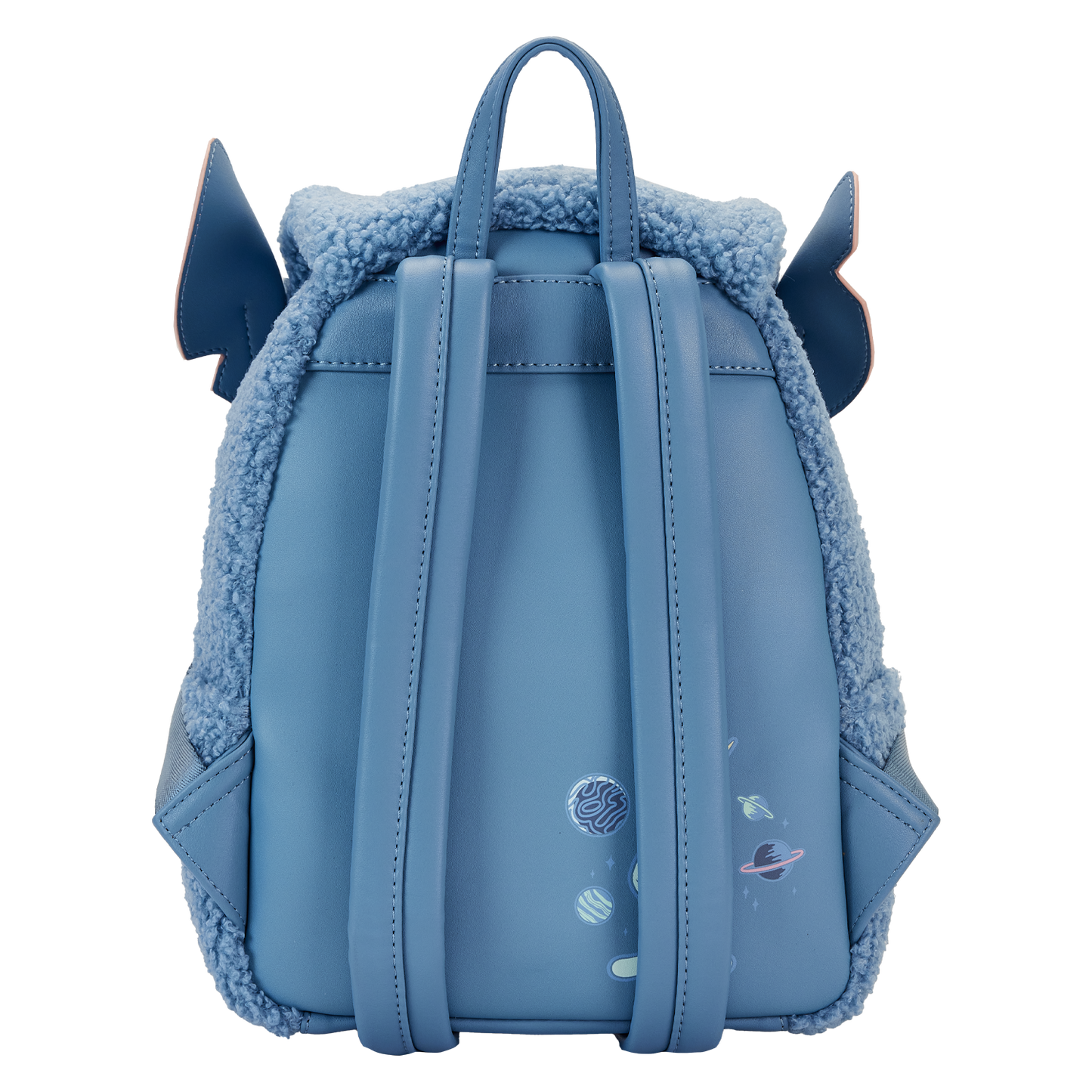 Need to escape? This Stitch plush mini backpack makes the perfect accomplice! This mini backpack is covered in blue sherpa material, and Stitch’s adorable face appears on the front. Just under his chin, you’ll find a zipper compartment for storing smaller items on your journeys. And, just under his paws, you’ll find another pocket. An invisible magnetic snap allows the paws to stay up while you secure your items. Applique ears poke out on the sides, and Stitch’s face comes to life in embroidered and applique details. On the back, you’ll find Scrump, surrounded by planets. Comes with adjustable straps and an interior drop pocket.